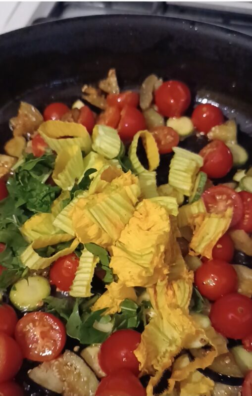 After browning the vegetables a little, they should not fall apart but remain crispy, add the chopped flowers and arugula.
