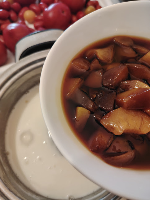 Even though the cream is in the photo, prepare all the ingredients before warming it, as it will make the subsequent steps easier; Soak the gelatin, cut the peaches into small pieces and mix them with the caramel.