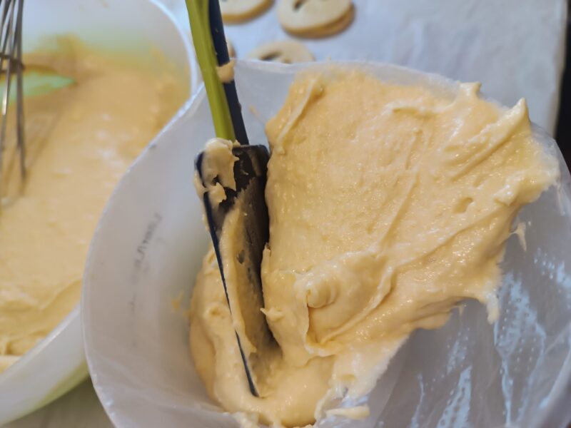Transfer the mixture into a piping bag and turn on the oven, setting it to 356°F