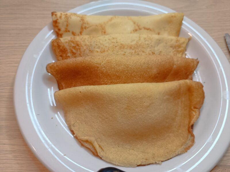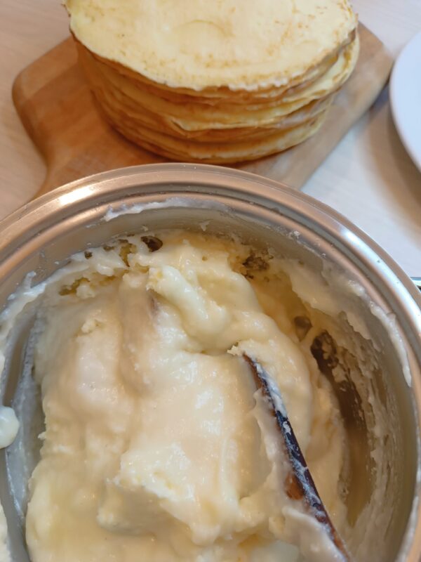 Spread on your crepes, making sure to let a layer slip over the edges to “stick” better.