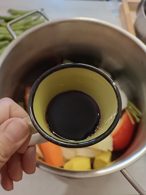 • Place everything in the large pot, and add the wine…