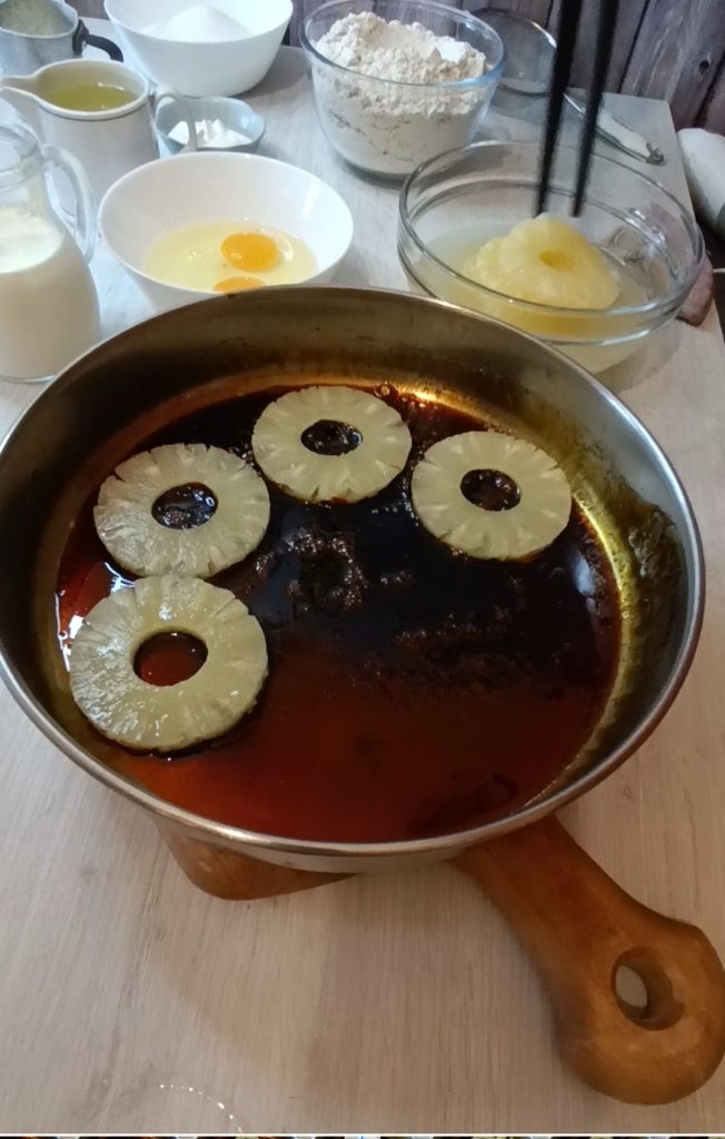 Prepare the caramel, or use ready-made caramel and pour it on the bottom of the pan; then arrange the pineapple following your creativity. I use the classic version; at this point, pour about one glass of pineapple juice; if you have more, you can soak the cake after baking. Set aside until use