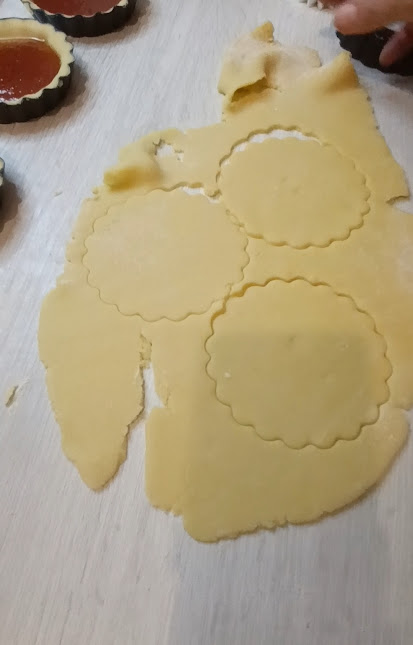 • Lightly flour the work surface and roll out the shortcrust, cut the discs for the tarts and fill them. If you want to get fewer tarts, you will get more cookies.