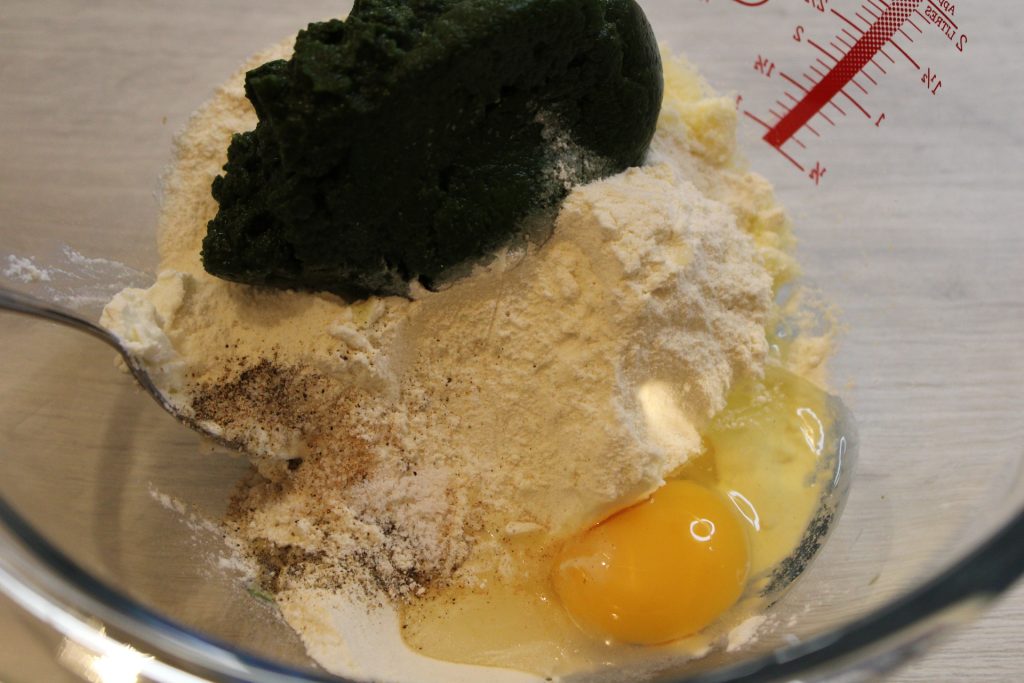 First, blanch the herbs or vegetables. Drain well and blend, combine with the rest of the ingredients in a large bowl: finely blended vegetables, flour, ricotta, egg, Parmesan or Pecorino, salt, pepper, nutmeg.