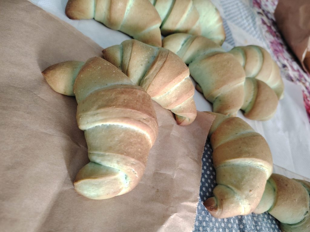 Very easy and green sweet croissants. Ideal for appetizers and buffets, to escape the usual sandwich. To brighten up children’s parties, for a tasty table. With the same dough, you can create different shapes. The coloring is completely natural, finely blended parsley and basil, yellow with turmeric, brown with cocoa.