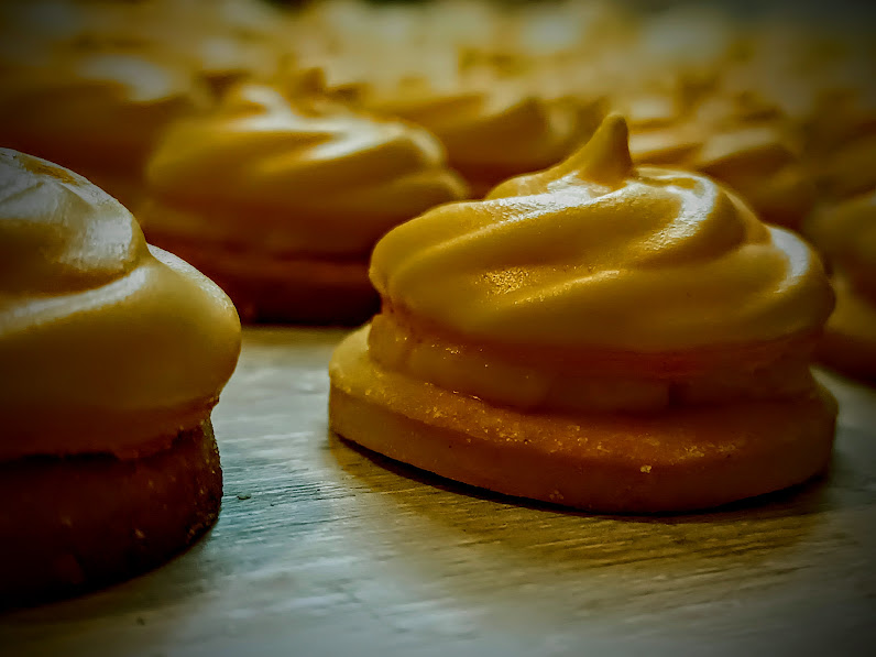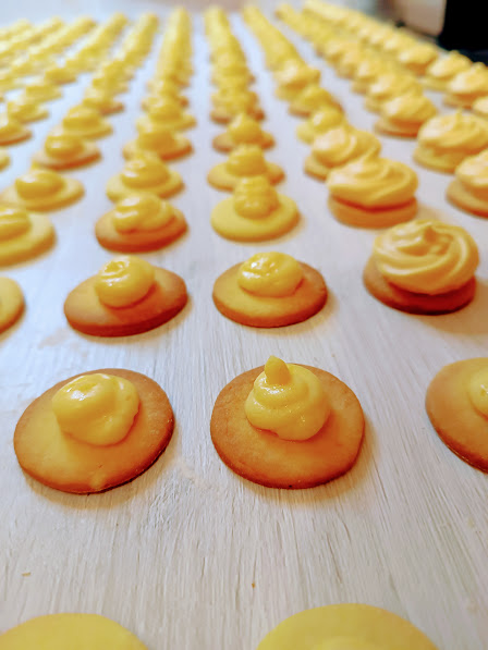 After the allotted time, roll out into a sheet about 1/8 inch thick and cut out many discs of 1 1/4 inch diameter, until the pastry is exhausted. Arrange them on the baking tray and bake at 350°F for about 10-15 minutes