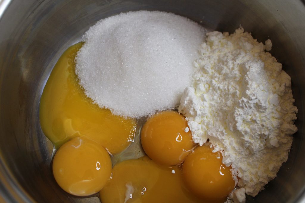• In a double-bottomed saucepan, combine the egg yolks, sugar, and cornstarch; mix carefully without whipping.