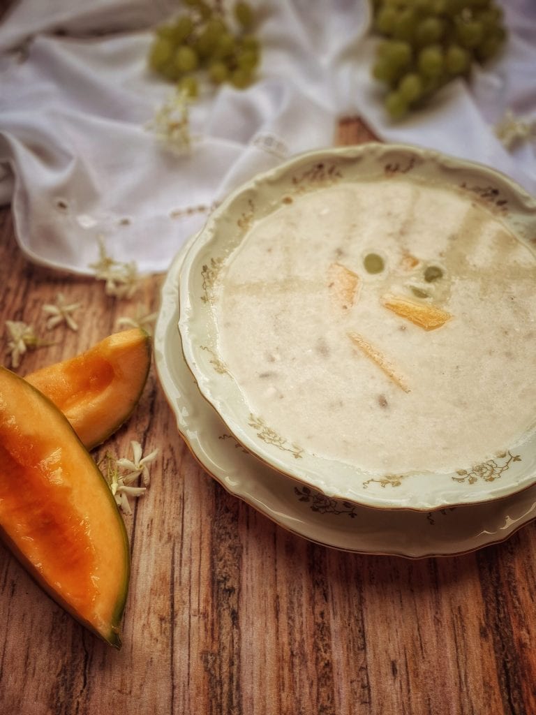 Let it rest in the refrigerator for at least 2 hours before serving with halved white grapes, cubed melon, and toasted almonds.
