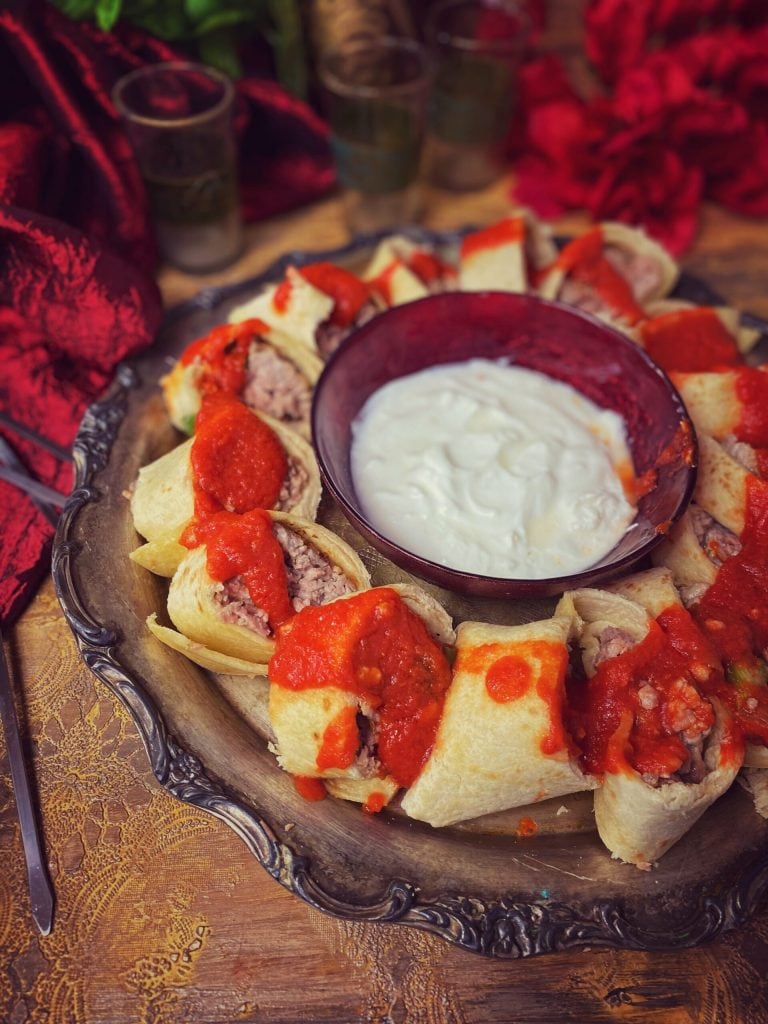 The Beyti kebab is a Turkish dish consisting of ground beef or lamb, grilled on a skewer (seekh kebab) and served wrapped in lavash (typical Armenian bread), topped with tomato sauce and served with yogurt.