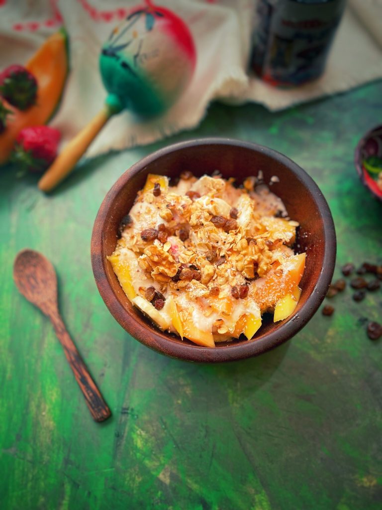 A fruit salad consisting of a variety of fruit cut into cubes, soaked in cream and topped with granola, shredded coconut, raisins and sometimes honey.