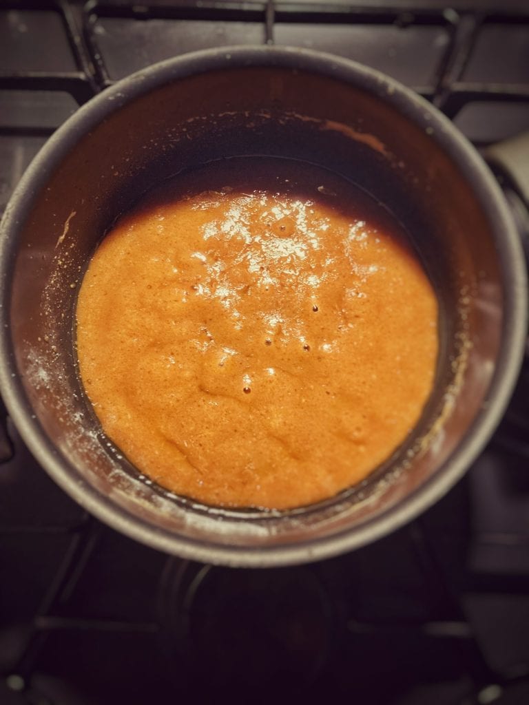 Add the brown sugar to the melted butter. Add the salt and bring to a boil until reaching 241°F.