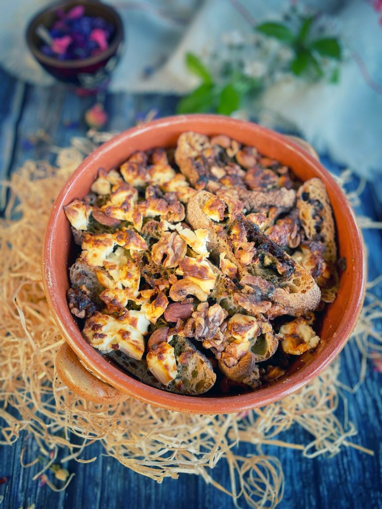 Repeat the process until you finish the ingredients, alternating bread with nuts and cheese.
