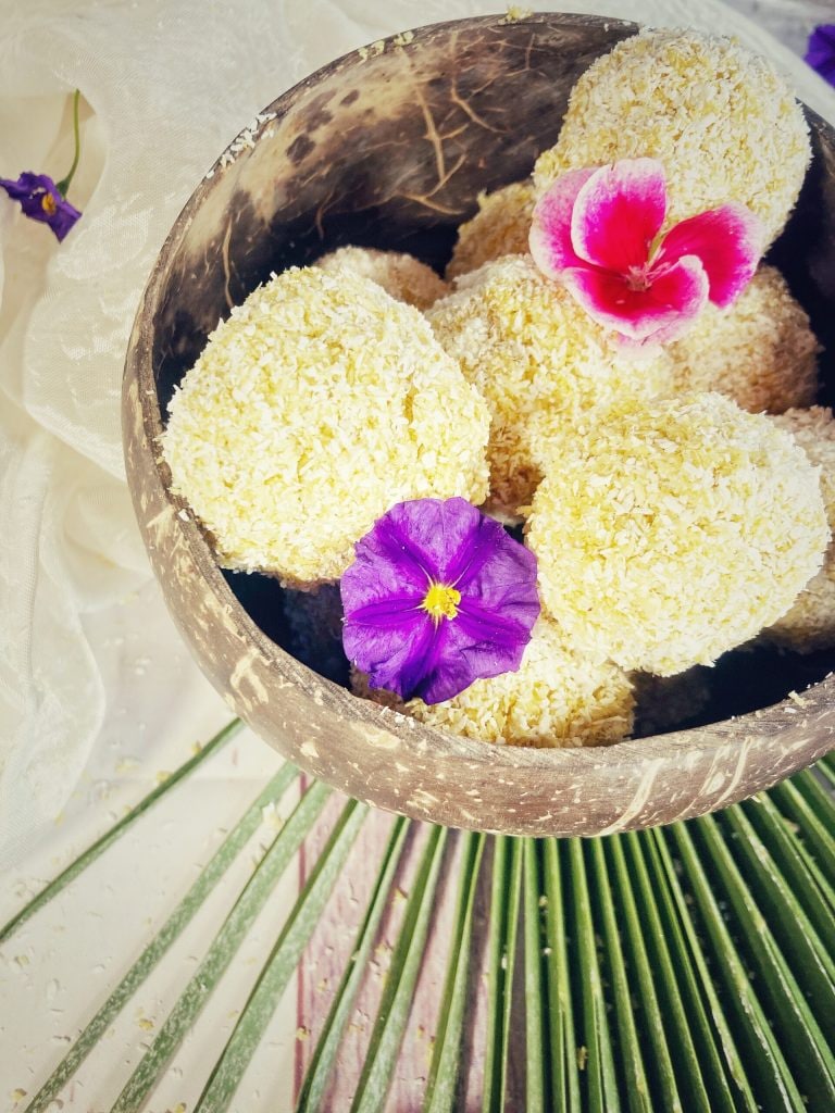 Form balls and roll them in the remaining grated coconut.