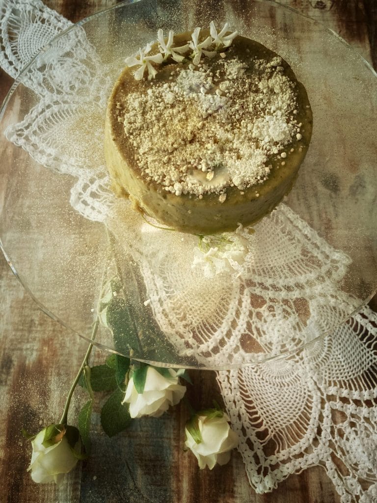 The texture of the Cotton Matcha Cheesecake is that of a light cake, similar to a soufflé, and fluffy, with an earthy taste of green tea that balances the creamy cheese flavor.