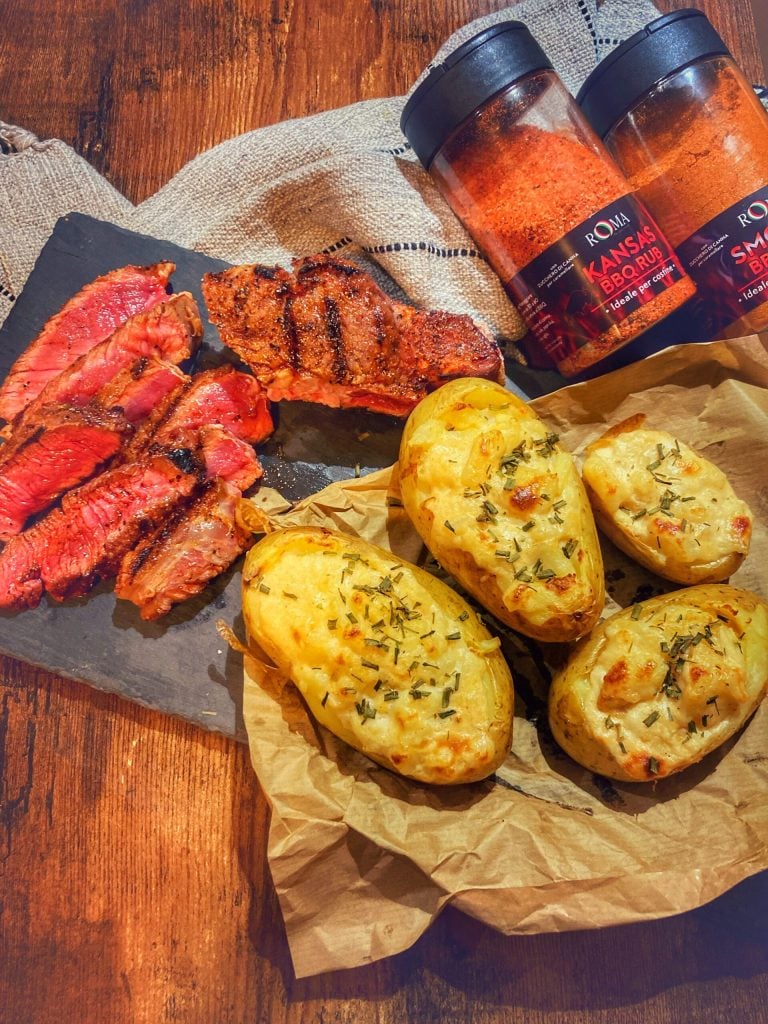 🥔Accompanied by Twice baked potatoes, or “twice baked potatoes” with sour cream, grated cheese, butter, and 2 teaspoons of “Smoked BBQ” rub from Roma Fine Foods.
