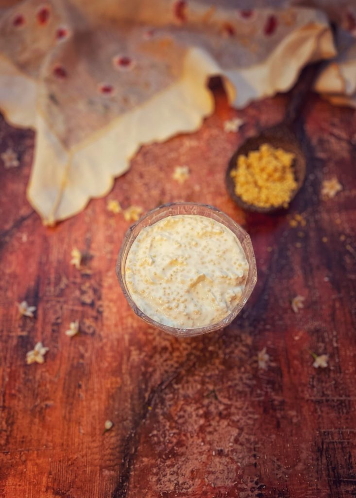 It is made with millet semolina and fermented dairy products, like yogurt or curdled milk, sugar, and is often enriched with spices and dried fruits.