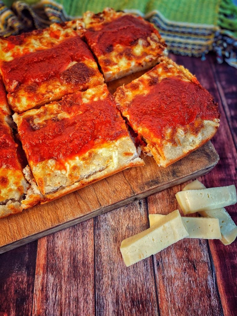 The Detroit Style Pizza is a rectangular pan pizza 14×10 inches with a thick, crispy, and chewy crust, traditionally topped to the edges with mozzarella and/or Wisconsin Brick cheese (which can be substituted with fontina or scamorza) that caramelizes against the heavy rectangular pan with high sides, and this edge is known as: “frico” .