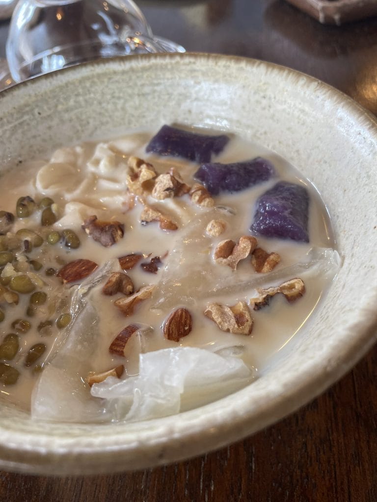 The Taiwanese douhua, like the Cantonese version, is often served as part of yumcha. Beans like mung beans, red beans, and peeled peanuts are usually added, along with soy milk, fruit, or taro balls.