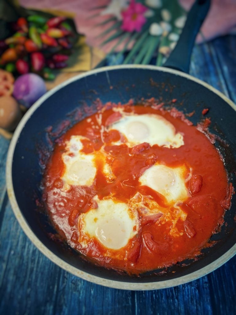 It is very similar to Chakchouka, a North African dish, which many people eat at breakfast, lunch, or dinner.