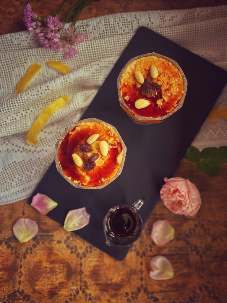Serve cold, in cups with raisins and almonds and palm syrup.