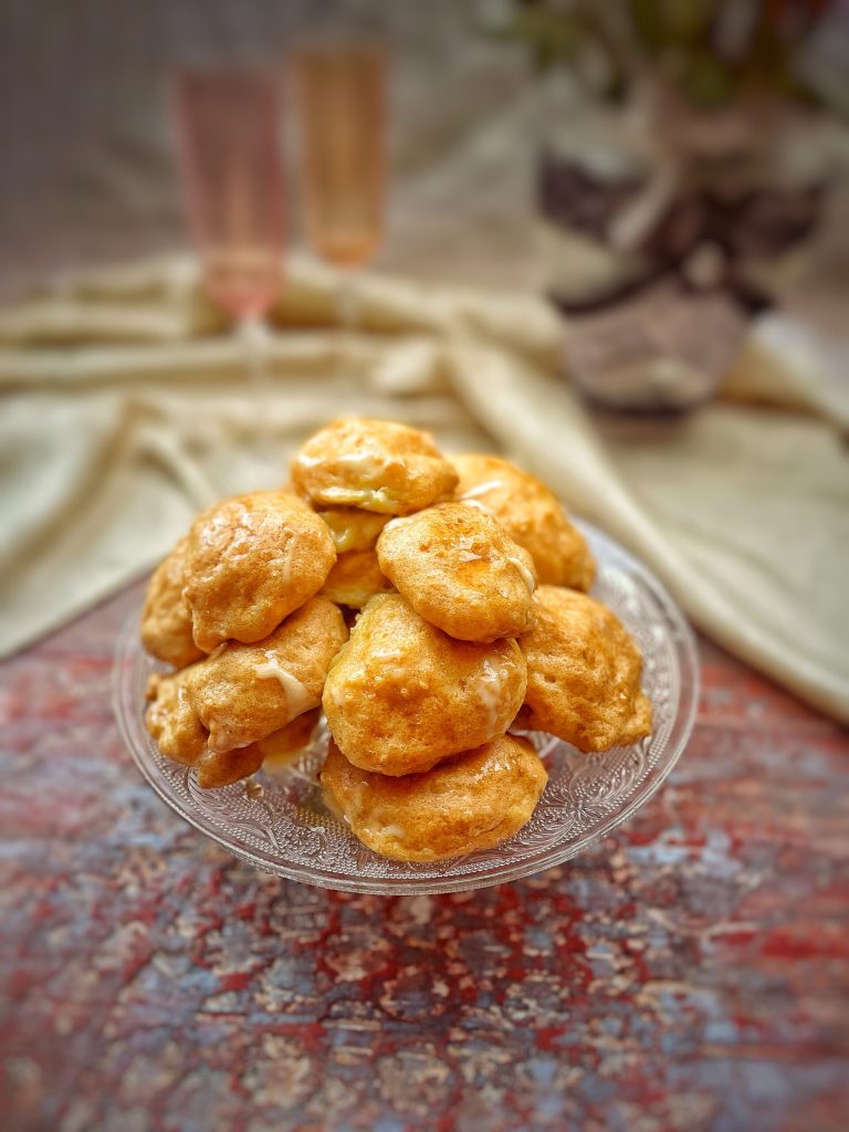 Using a piping bag, form the cream puffs on parchment paper. Bake in a static oven at 392°F (200°C) for 25–30 minutes (do not open the oven during baking!).Once cooled, make a small hole at the base of each cream puff.