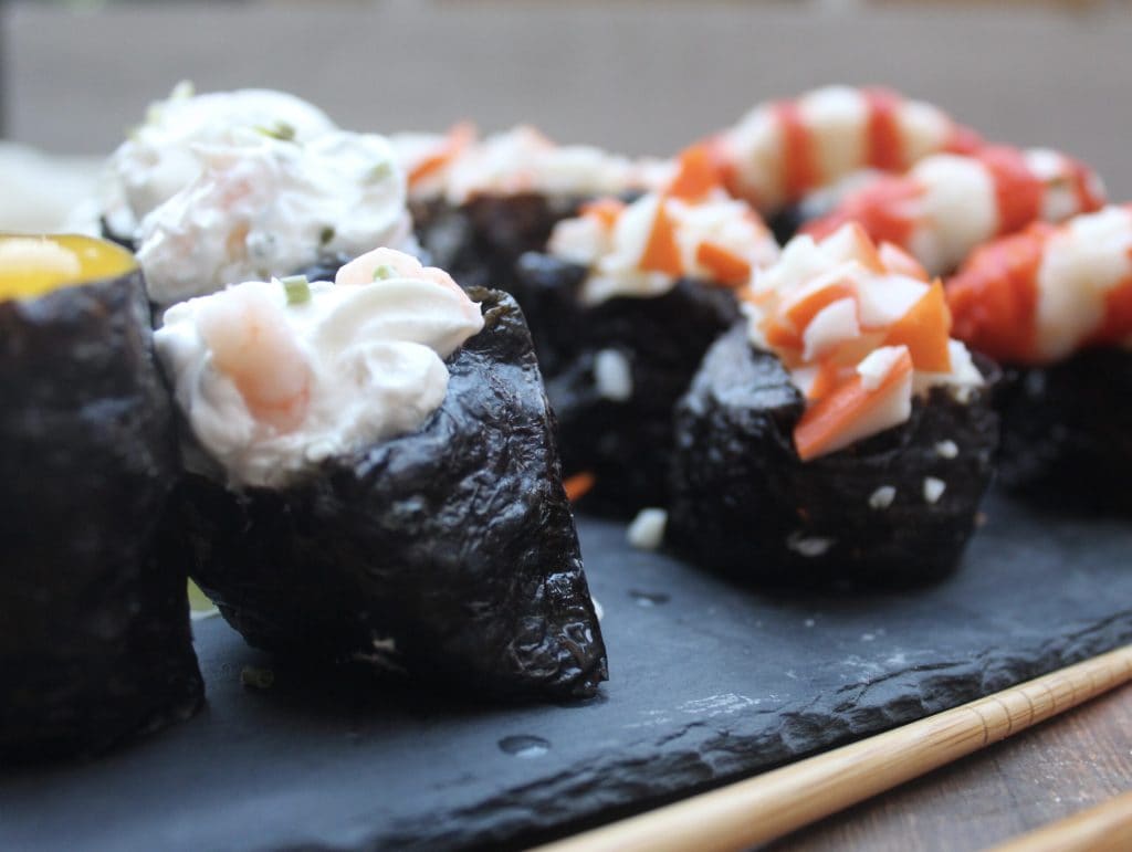 Among the main types of Gunkan popular in Italy, I tried to make: salmon, crab, with quail egg, ebi (shrimp with cheese and chives) and shrimp.