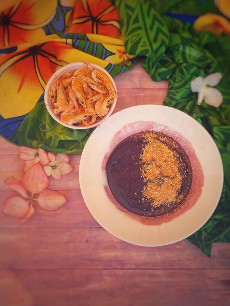 Here, one of the most traditional ways to eat it (see recipe), is by adding farinha d’agua, made from fermented manioc flour, and dried shrimp, cold or at room temperature.