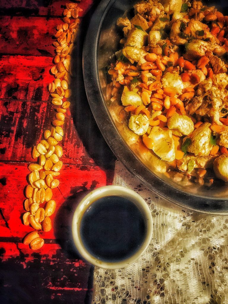 Kung Pao Chicken or Gong Bao Chicken (宫保鸡丁, Gōngbǎo jīdīng) is a typical dish from Sichuan, China, made with chicken, chilies, and raw peanuts.