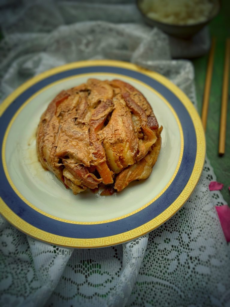 Traditional recipes of Mei Cai Kou Rou involve frying the partially cooked pork belly to achieve a wrinkled skin effect, known as “tiger skin” 虎皮.