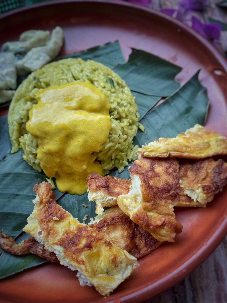 It involves rice cooked in coconut milk with aromatic spices, often served with various sides such as chicken, eggs, tempeh, coconut cream, and sambal.