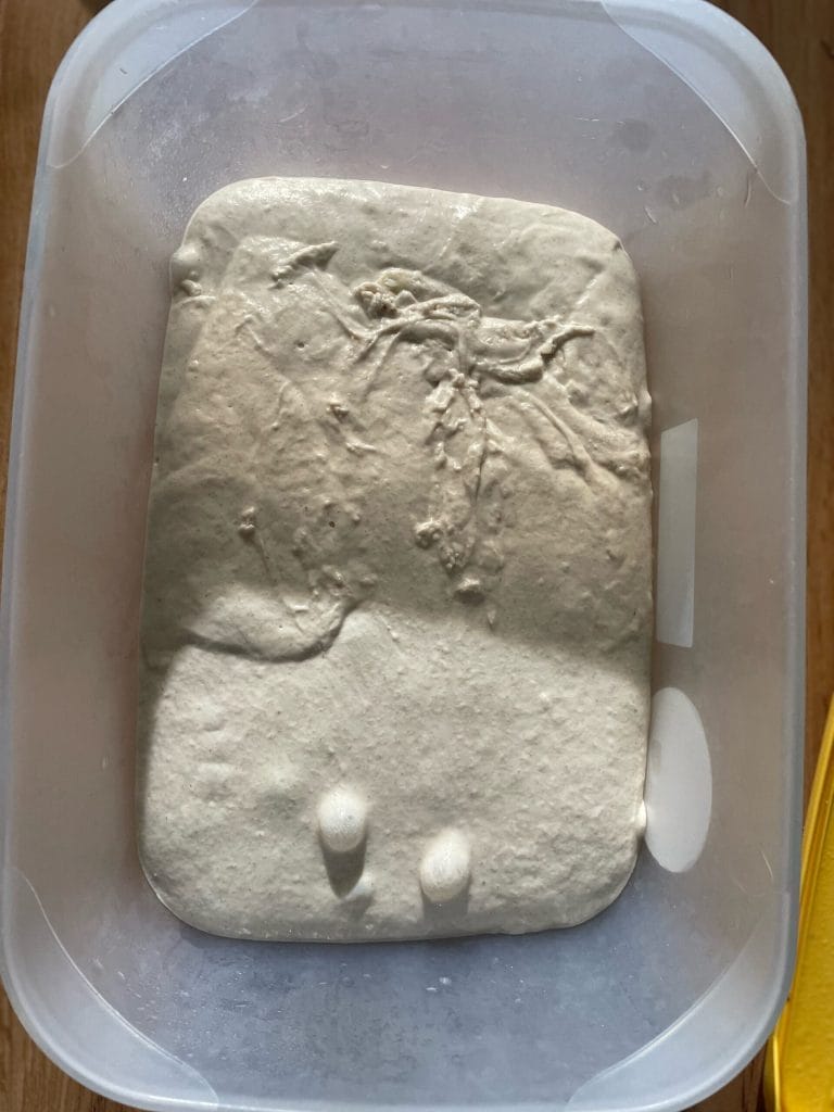 Add sourdough, knead well. Add salt + the remaining 30 g of water.