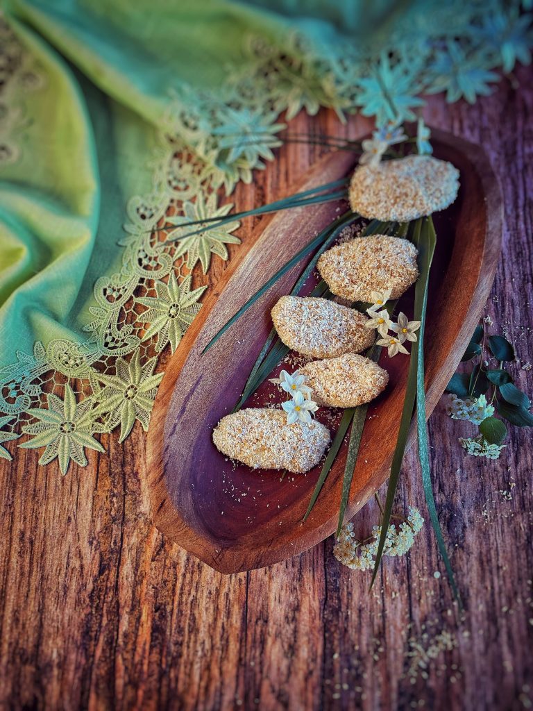 From the dough, thin patties are made, cooked in boiling water, and then covered with grated coconut, toasted sesame seeds, and sugar.