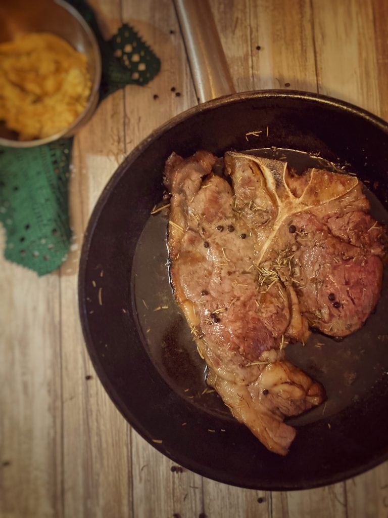The Pan seared steak can be translated as “pan-cooked steak” with butter, but it is a slightly more complex preparation than its translation.