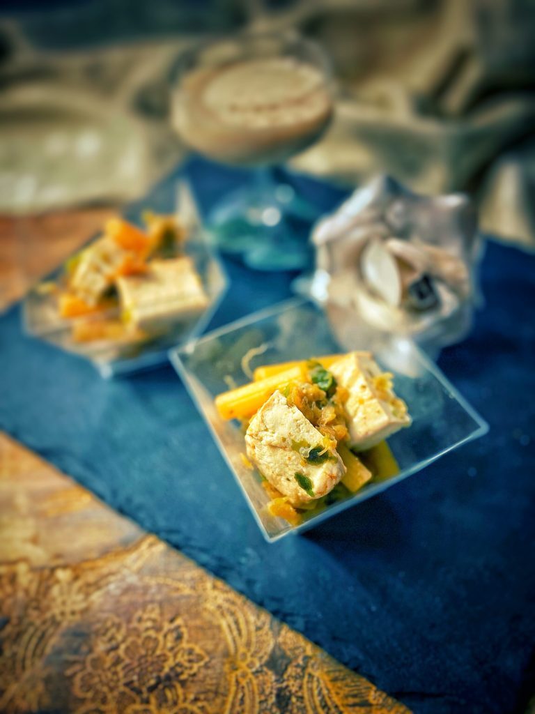 I present them to you in a “finger food” version accompanied by a vegan Milk Punch, with soy milk, to show you the versatility of tofu, too often unjustly opposed.