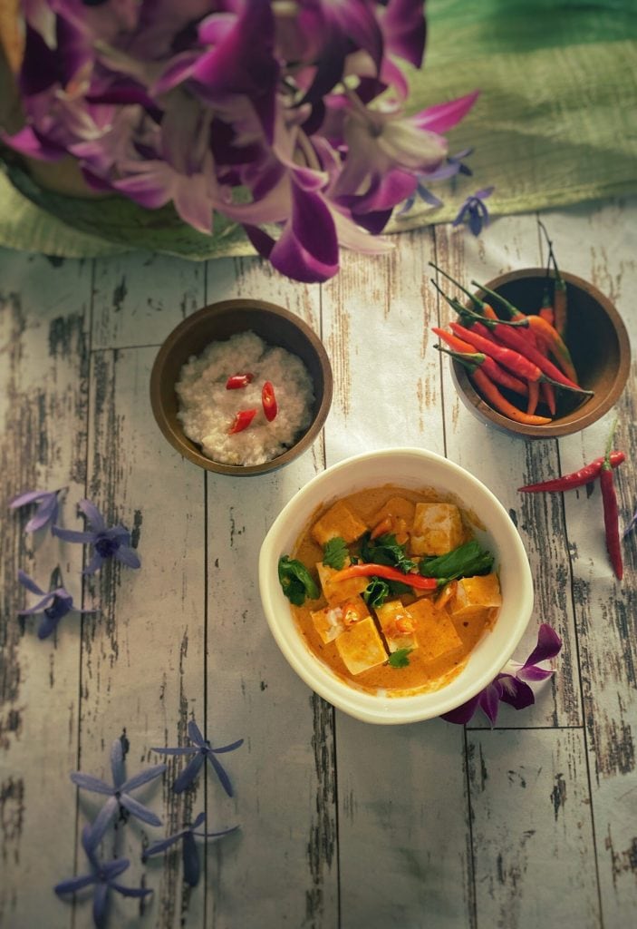 Traditional Phanaeng curry is made with thinly sliced beef or pork, but it can also be cooked with other meats, fish, shrimp, etc. and for vegetarians, it can be made with vegetables and/or tofu, as in this case: Phanaeng Tofu.