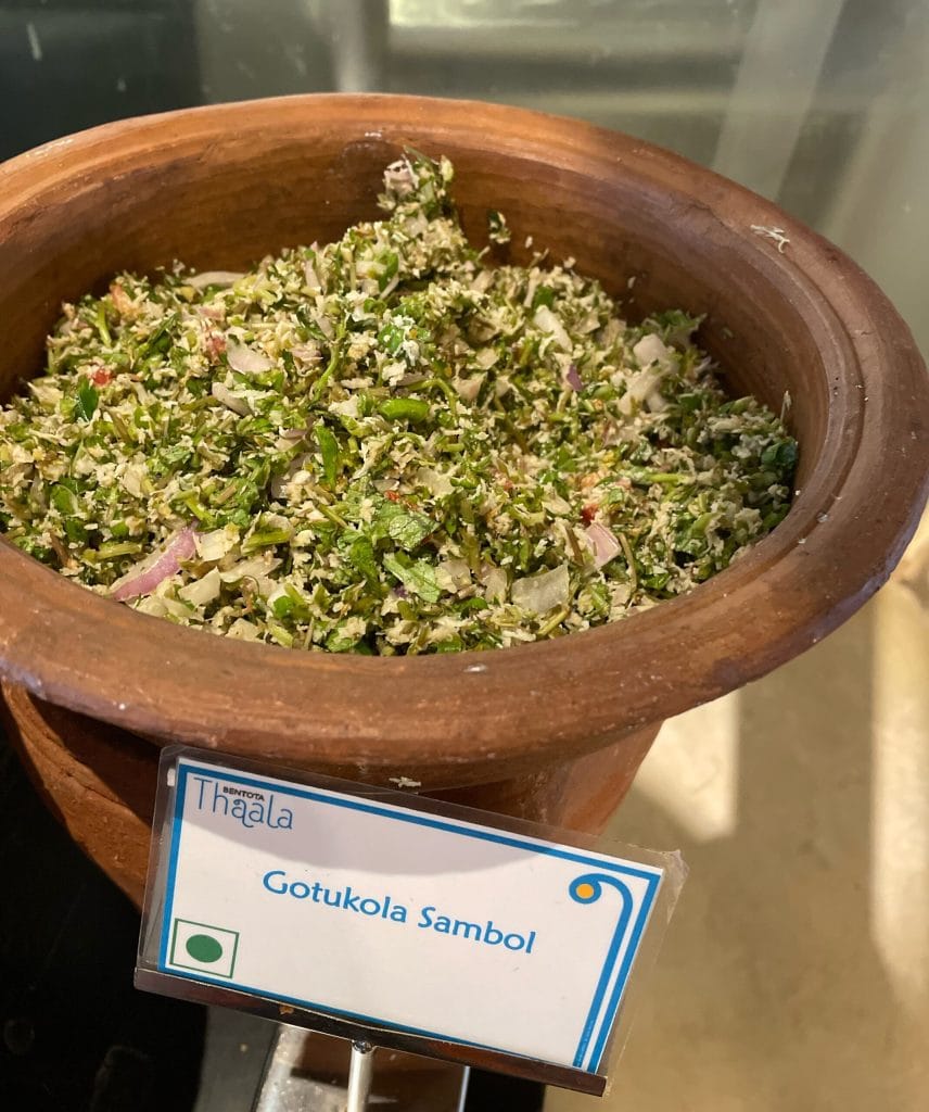 The gotukola sambol, is with centella asiatica: a very popular coconut and herb salad in Sri Lanka. It is a great accompaniment to rich and spicy dishes.