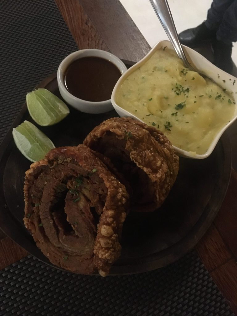 The picture below shows the Rolled Pork Crackling tasted at the restaurant “Porto Gerais” in Porto Seguro, accompanied by manioc puree.