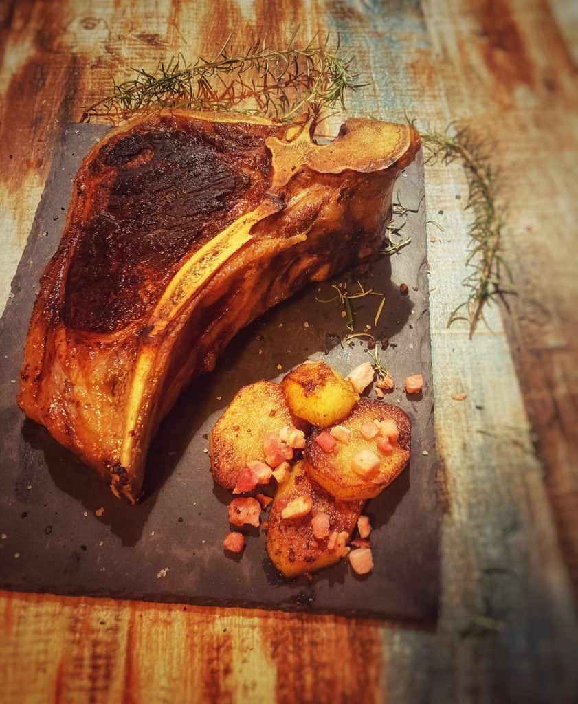The best way to enjoy Rubia Gallega meat is certainly the Chuletón, a rib steak five fingers thick, weighing over a kilogram, usually served medium/rare*, covered with the characteristic yellowish fat crust.