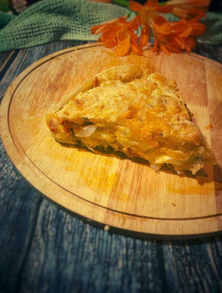 The traditional scarcedda should not be eaten hot. It should rest at least 12 hours (better 24) so the flavors of the sausage and cheese can “migrate” into the dough.