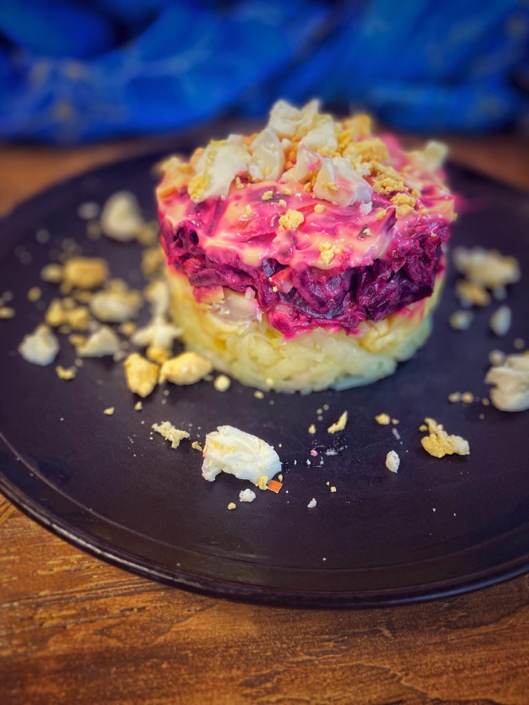 ▶A culinary artifact of late Soviet cuisine that became widespread in the 1970s, becoming a festive dish and an attribute of the New Year’s table along with Olivier salad.