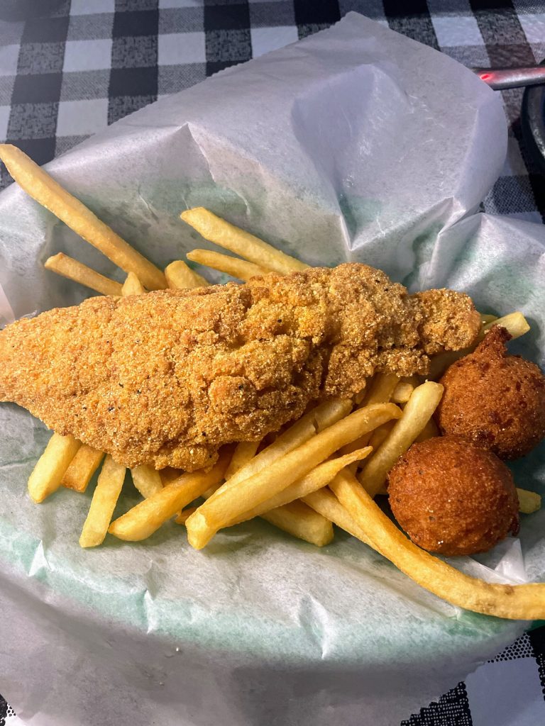 The dish is often served in fillets breaded in a spicy coating and fried, accompanied by hushpuppies, cole slaw, green beans, or fries.