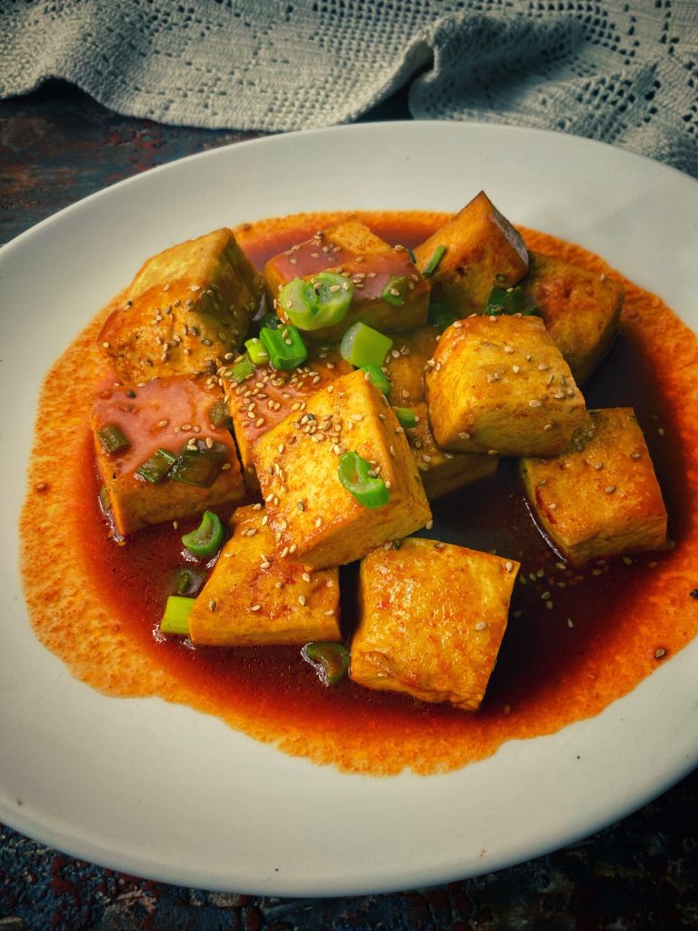 Crispy pieces of tofu coated with a sticky and spicy Korean sauce made from Gochujang, whose main ingredients are: red chili powder (gochugaru; 고추가루), glutinous rice starch, fermented soybeans, and salt.