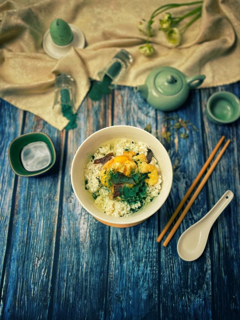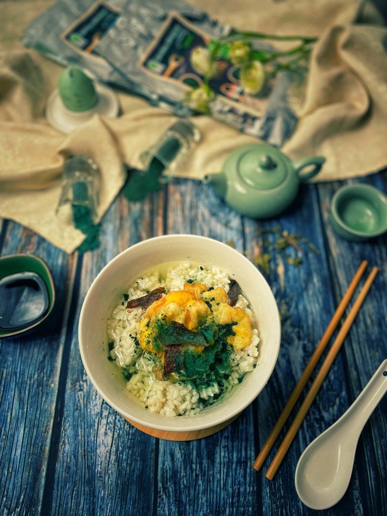 Place the gohan rice (see recipe) in the bowl, add the egg, nori seaweed, and spirulina, then add the tea and optionally a teaspoon of soy sauce.
