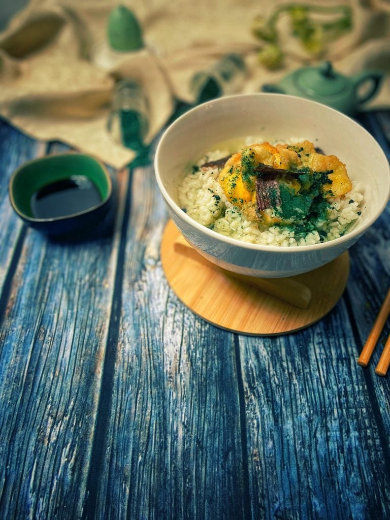 In my case, I chose a tamago kakiage, or egg tempura, served on rice with nori seaweed and spirulina flakes.