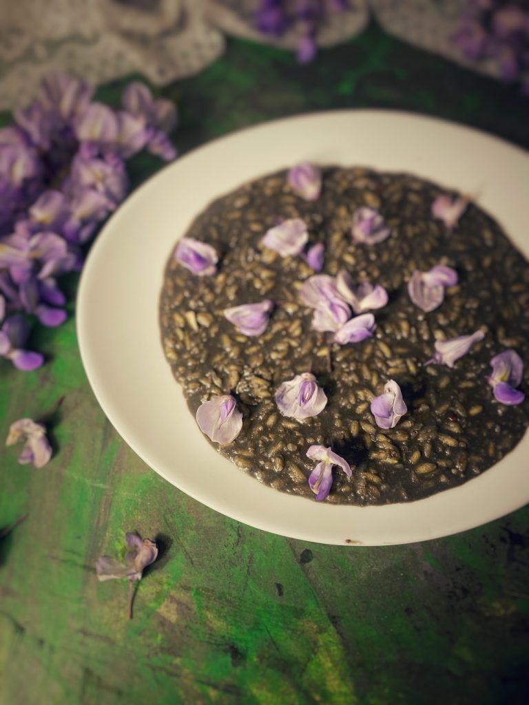 The Vegan Squid Ink Risotto with Wisteria looks like squid ink risotto, but in reality, it’s not.