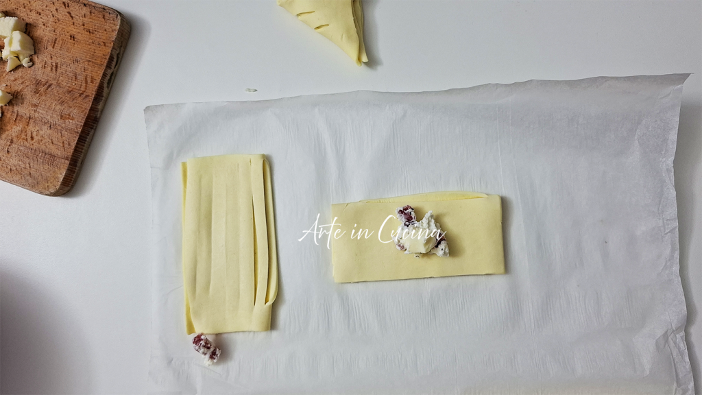 • Fold the cut part back onto the whole side, then turn the rectangle to the smooth side. Mix the ricotta with the salami and the provola cut into small pieces, add a sprinkle of pepper and Parmesan if you prefer.