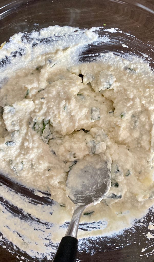 En un bol, introduce todos los ingredientes: la ricotta de vaca, la de oveja, un huevo, dos cucharadas de parmesano, la albahaca y ralla la cáscara del limón.