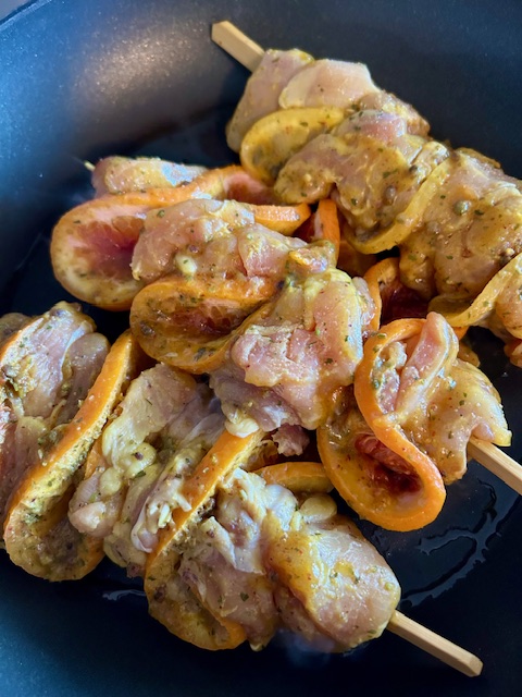 Brochetas de pollo con cítricos y especias cocinadas en sartén.