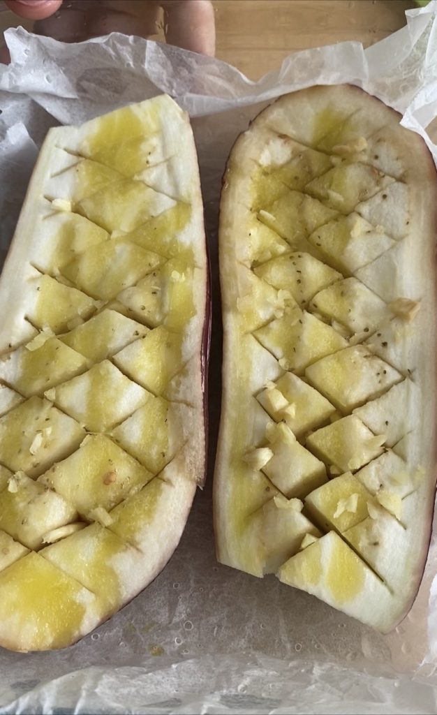 Corta la berenjena a lo largo y haz cortes formando rombos con un cuchillo.