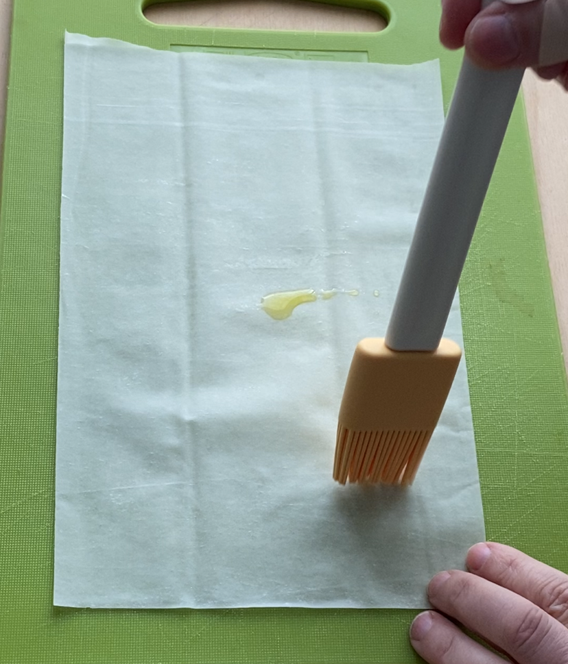 Pincelar con un poco de aceite una hoja de pasta filo, doblarla por la mitad y luego colocar sobre esta hoja otra hoja doblada por la mitad.